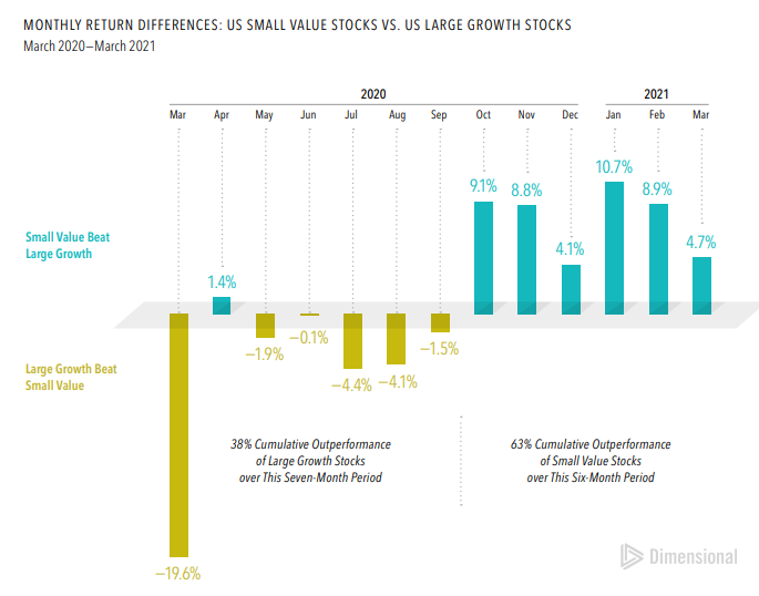 As shown in the first chart (March 2020–March 2021), large growth stocks dominated early in the pandemic—beating small value by 38% over a seven-month stretch.