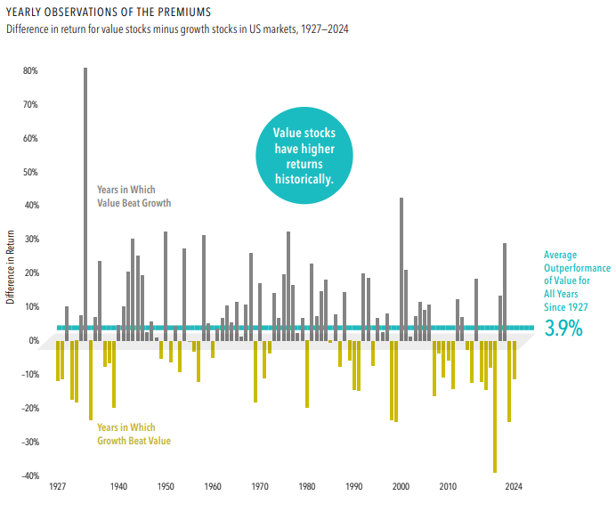 But that outperformance doesn’t show up smoothly. Some years, growth wins—sometimes by a lot. Other years, value dominates.
