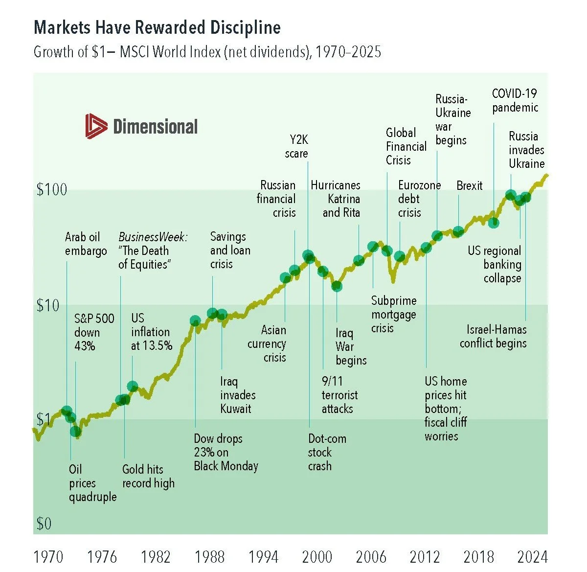 This is borne out in historical stock returns. Global equity markets have continued an upward climb even in the face of economic and political upheavals. We don’t have to look far for illustrative examples. During the past few years, stock markets have had positive returns despite multiple wars being fought around the world.