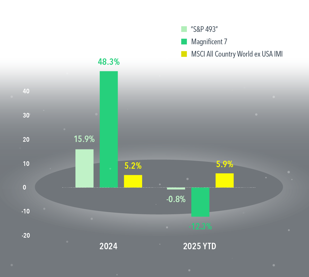 Past performance, including hypothetical performance, is no guarantee of future results. Actual investment returns may be lower. Year-to-date returns are as of March 12, 2025. The S&P 500 Index total returns for 2024 and 2025 YTD were 25.0% and –4.6%, respectively. Returns for the “S&P 493” are a weighted average of S&P 500 Index constituents excluding the Magnificent Seven. “Magnificent Seven” returns are a weighted average of the seven companies. Indices are not available for direct investment; therefore, their performance does not reflect the expenses associated with the management of an actual portfolio. Filters were applied to data retroactively and with the benefit of hindsight. Groups of stocks and their returns are hypothetical, not representative of indices’ actual investments, or actual strategies managed by Dimensional, and do not reflect costs and fees associated with an actual investment. S&P data © 2025 S&P Dow Jones Indices LLC, a division of S&P Global. This information is intended for educational purposes and should not be considered a recommendation to buy or sell a particular security. Named securities may be held in accounts managed by Dimensional. The Magnificent 7 stocks are represented by Tesla, Meta, Alphabet, Amazon, NVIDIA, Apple, and Microsoft. FOR RESEARCH AND EDUCATIONAL PURPOSES.