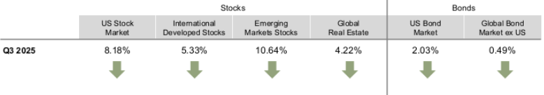 It was a great year in the stock market in the third quarter of 2025. You can see below that the US stocks as a whole rose over 8%, emerging markets were a star at over 10%. And US Bonds, up 2% is a great quarterly result.